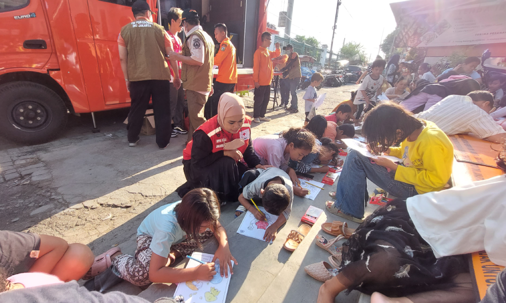 Kedoya Utara, Jakarta Barat. PMI Jakarta Barat berkolaborasi dengan Badan Penanggulangan Bencana Daerah (BPBD) DKI Jakarta memberikan layanan Psychology Support Program (PSP) kepada penyintas kebakaran di Pesing Koneng, Kedoya Utara, Jakarta Barat.